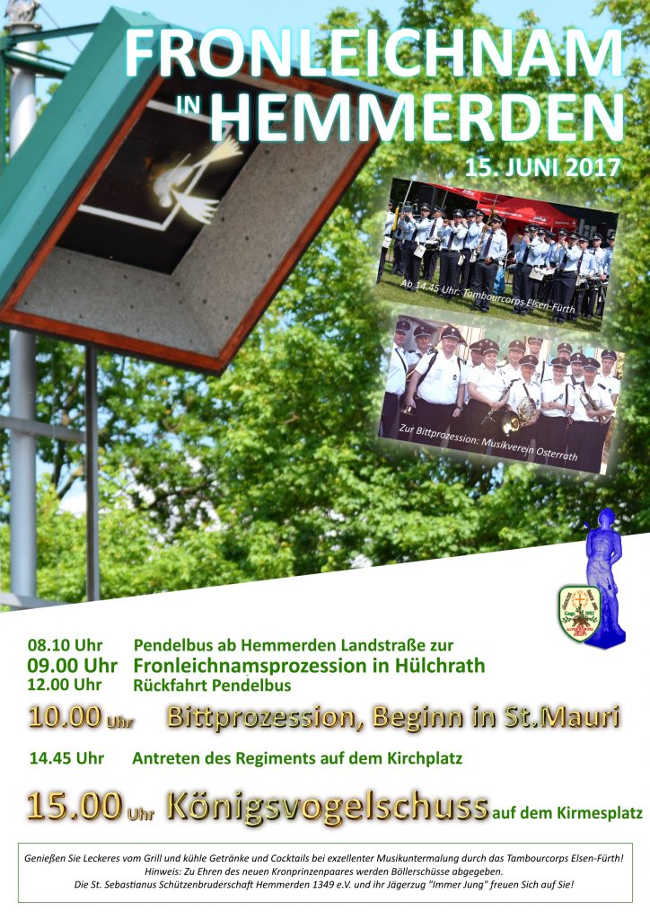 Der Fronleichnamstag in Hemmerden wird auch dieses Jahr wieder mit Spannung erwartet, denn um 14:45 Uhr zieht das Regiment, begleitet durch die Klänge des Tambourcorps Elsen-Fürth, gemeinsam zum Kirmesplatz. Es gilt die Nachfolge unseres aktuellen Kronprinzenpaares Markus Schmitz und Bianka Derichs, welche am Schützenfestfreitag gekrönt werden, zu ermitteln.