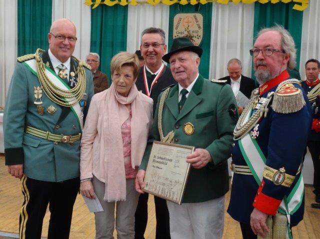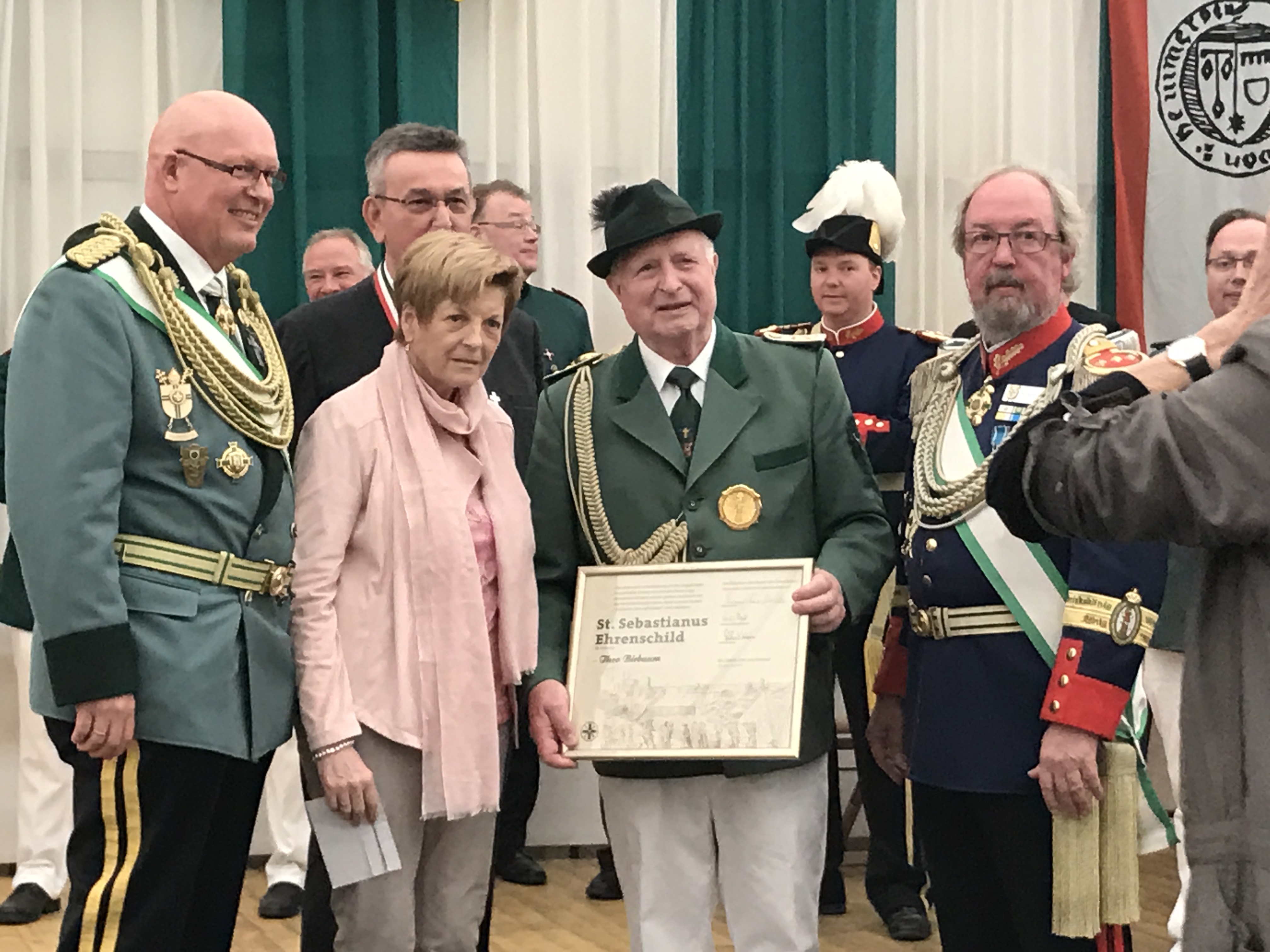 Theo Birbaum ist Gründungshauptmann des Jägerzuges St. Hubertus und seit 62 Jahren Mitglied der Bruderschaft. 32 Jahre lang diente er im Vorstand als Königsadjutant und wurde durch seinen enormen Einsatz eine feste Größe des Dorfes und, wie der Diözesanbundesmeister betonte, weit darüber hinaus. Pastor Steinröder stellte heraus, wie die Familie Birbaum ihr Leben für ihre Kinder und ihre Mitmenschen ausrichte. Alle drei Herren waren sich sicher, dass diese Leistung Theo Birbaums nicht ohne seine Frau Ria möglich gewesen wäre, die sie konsequenterweise ebenfalls auf der Bühne ehrten. Bescheiden hatte Birbaum zuvor Ehrungen zumeist abgelehnt, für ihn sei dass, was er tue eine Selbstverständlichkeit, aber so Kuck: „Lieber Theo, dieser Ehrung kannst du dich heute nicht entziehen!“