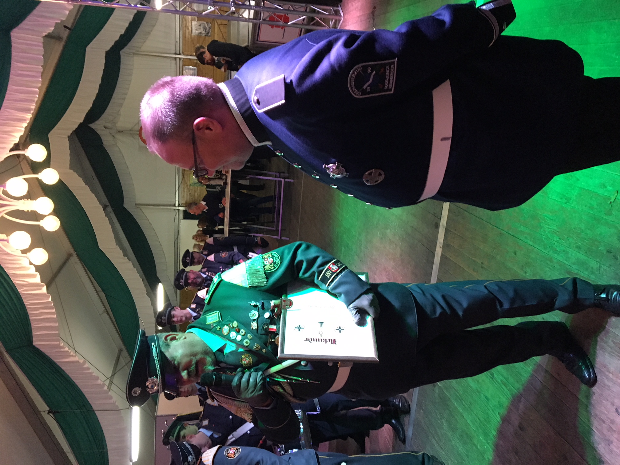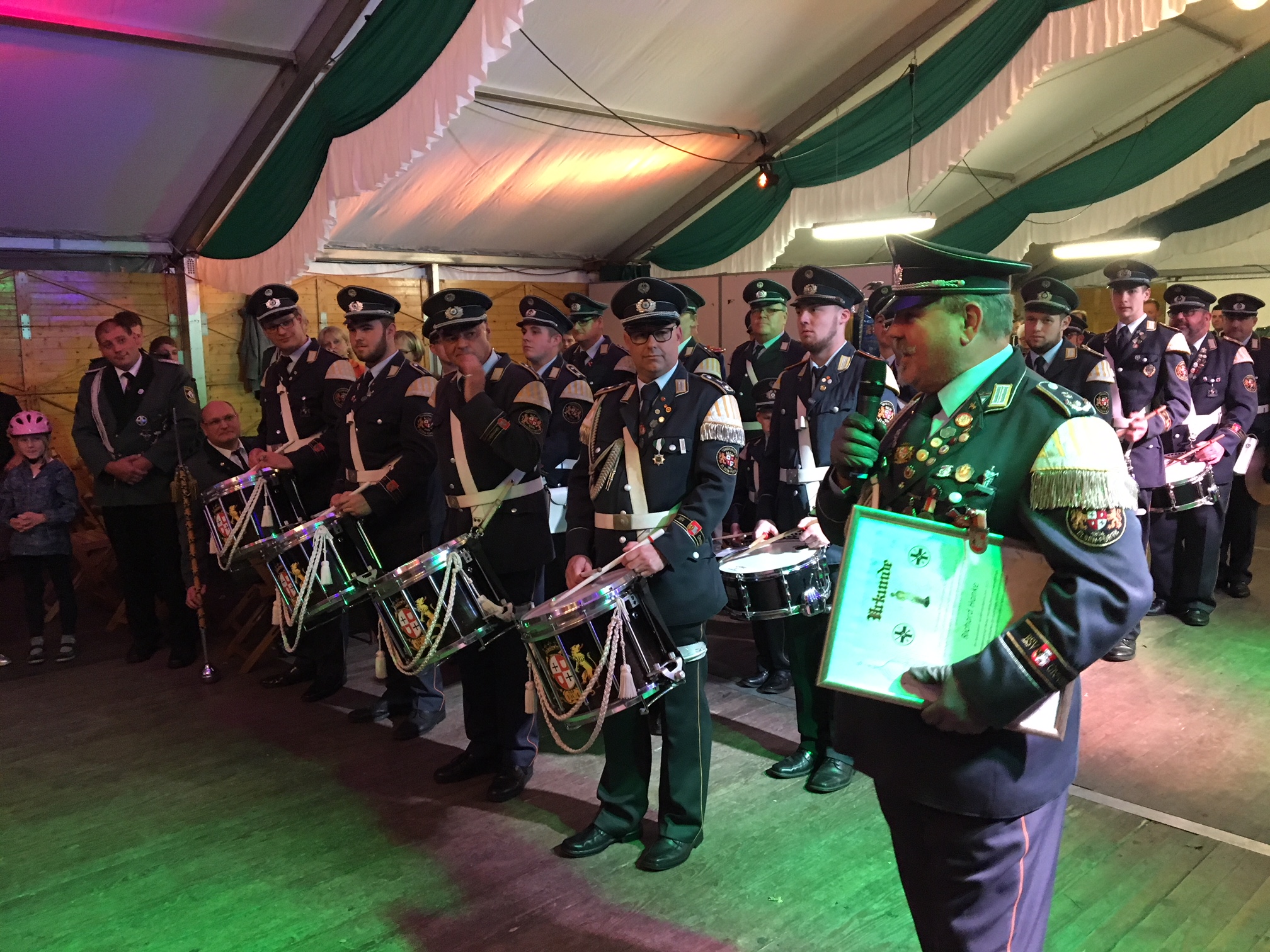 Bevor aber S.M. Markus Schmitz und Königin Bianka Derichs im Mittelpunkt standen galt es, einen alten Freund zu ehren: Richard Hanke, seines Zeichens Major des Tambourcorps Elsen-Fürth und langjähriges Mitglied der Bruderschaft wurde für seine 50jährige Tätigkeit in Hemmerden geehrt. Der erste Vorsitzende überreichte ihm einen Verdienstorden und eine Urkunde und lobte nicht nur sein musikalisches Können, sondern auch sein stetiges überragendes Engagement. Sein Tambourcorps spielte danach noch ein Ständchen für seinen Major bevor es etwa eine Stunde später zur Begrüßung und dem Ehrentanz des Königspaares und der Zugkönigspaare ging. Zur Band „Klangsstadt“, die wieder einmal die Stimmung richtig einheizte, wurde dann noch lange gefeiert. Der Sonntag wartete nicht nur mit Karusssel, Hüpfburg und Spielzeug für die Kinder auf, die Regimentsfahnengruppe hatte es sich zu ihrem Jubiläum auch nicht nehmen lassen ein Frühstücksbuffet zu spendieren. Die „Köhm-Musikanten“ sorgten musikalisch für die Frühschoppenstimmung und der Zirkus Traber gab eine Einlage. So feierten die Hemmerder bis spät in den Nachmittag, bevor viele noch die heimischen Gaststätten besuchten.
