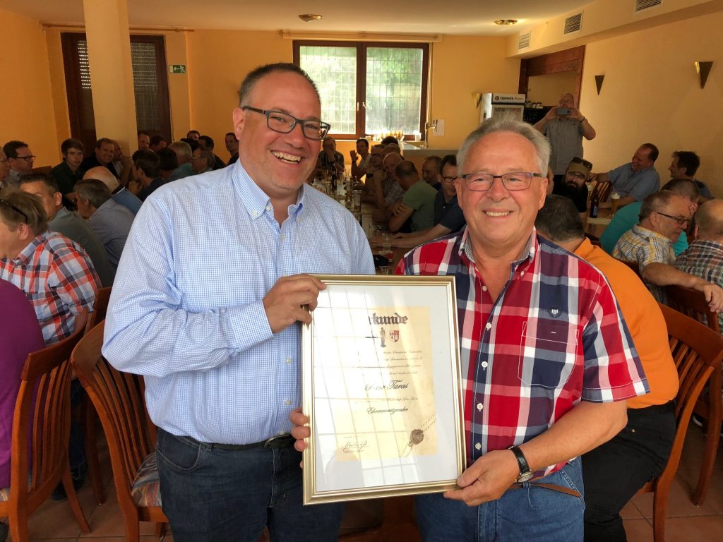 Der ehemalige Vorsitzende Peter Taras wurde unter dem Applaus der Mitglieder in den Ehrenvorstand berufen. Taras, der 52 Jahre Mitglied der Bruderschaft ist, diente nicht nur in seinem Jägerzug „St. Hubertus“ als Spieß und Hauptmann, sondern war auch fast ein Vierteljahrhundert in verschiedenen Vorständen vertreten. Dort hatte er die Ämter des Adjutanten des Oberst und Grenadiermajors inne, war dann Grenadiermajor und schließlich Vorsitzender. Er und seine Frau Helga waren außerdem das Hemmerder Königspaar des Jahres 2005/06. Der 1. Vorsitzende Markus Deuß überreichte ihm unter Anwesenheit des Präses Andreas Schönfeld die Ernennungsurkunde als Ehrenvorstandsmitglied. Als eines von vier Mitgliedern des Ehrenvorstands darf er sich nun, gemäß seines höchsten erreichten Ranges, Ehrenvorsitzender nennen.Die weiteren Versammlungspunkten beschäftigten sich mit den Vorbereitungen des Schützenfestes und den anstehenden Terminen, die Hutsammlung wurde für die Bruderschaftsaktionen für die Hemmerder Kinder, hier den Kinderferienspaß, die Kirmesplatzeröffnung und die Zeltkirmes zur Spätkirmes.