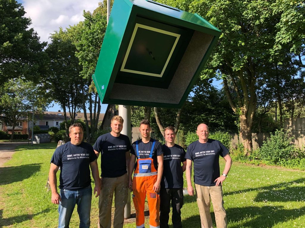Für den Umbau musste der Geschossfang zunächst demontiert werden. Die eigentlichen Arbeiten fanden schließlich in einer Schreinerei in Hemmerden statt. „Dort hatten wir alle erforderlichen Hilfsmittel zur Verfügung. Jeder wusste, was zu tun war.“ Die Schützenbrüder versetzten die stählernen Seitenwände, erneuerten die Holzauskleidung und integrierten eine automatisch rückstellbare Absturzsicherung. Schließlich wurde der Geschossfang frisch lackiert und wieder am Mast montiert. Markus Deuß, erster Vorsitzender des Schützenvereins, ist zufrieden: „Die Schützenbrüder haben super Arbeit geleistet. Dank der finanziellen Unterstützung von RWE konnten wir den Umbau in kürzester Zeit fertigstellen. So war das Vogelschießen ein voller Erfolg!“