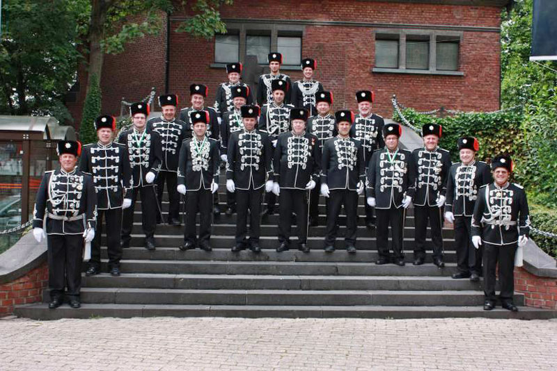 Schützenfest 1998 (75 Jahre nach Gründung) – untere Reihe von links nach rechts: Hans Josef Voigt (Hauptmann), Peter Rauscher (Leutnant), Dieter Oehmen, Martin Steinwartz (Fähnrich), Jörg Moras (Spieß) – linke Treppenreihe von unten nach oben: Mirko Kluge, Dirk Schill, Norbert Kewitsch, Adi Erdwey, Klaus Helbig, Wolfgang Bayer†, Bernhard Schösser – rechte Treppenreihe von unten nach oben: Henry Jaworsky, Heinz-Willi John, Gerd Fußangel, Günter Wichmann, Josef Donné, Horst Faßbender, Thorsten Hüsgen, Frank Kluge – obere Reihe von links nach rechts: Franz-Hubert Zajonz†, Hans Mausberg, Lothar Kluge, Wolfgang Groewer, Roland Eitz