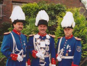 Im nachkommenden Jahr stand eine wichtige Entscheidung an. Der inzwischen auf 10 Mitglieder angewachsene Zug musste sich entscheiden, welche Uniformen man in Zukunft tragen wolle. Da von Anfang an ein Grenadierzug, fiel die Entscheidung nicht schwer. Man legte sich auf die traditionelle Uniform der Grenadiere mit Cut, Zylinder, weißem Hemd und weißer Hose fest. So ergab es sich, dass von diesem Jahr an die Regimentsfahnengruppe in schmucker und adretter Uniform an den Feierlichkeiten der Bruderschaft teilnimmt.